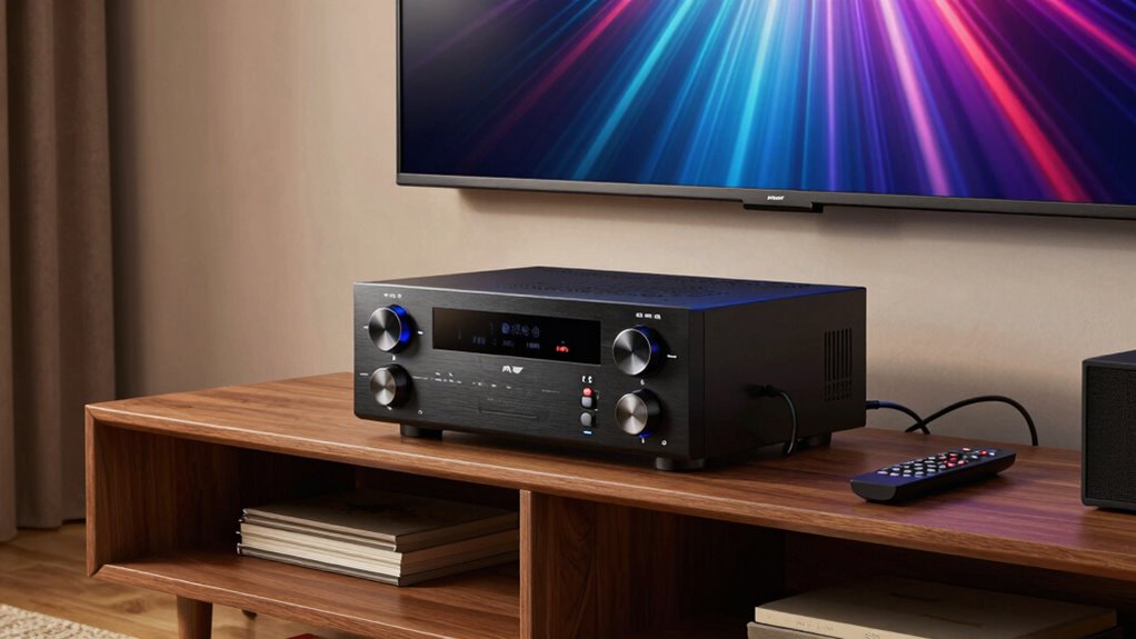 An AV receiver is the centerpiece of a home theater setup, acting as the hub that connects and powers all your audio and video components. It’s the device that keeps everything running smoothly, allowing you to enjoy a seamless entertainment experience. One of the key features of modern AV receivers is wireless connectivity. This means you can easily connect your smartphones, tablets, or wireless speakers without dealing with a tangle of cables. With built-in Wi-Fi or Bluetooth, you can stream music, play content directly from your devices, or connect to smart home systems effortlessly. This wireless flexibility simplifies your setup and gives you more options for controlling your audio and video sources. Additionally, many AV receivers support multi-channel audio formats, which enhance your home theater experience by providing immersive surround sound. Proper sound calibration is crucial for achieving optimal audio quality, and many modern receivers include advanced tools to assist with this process. Beyond connectivity, your AV receiver also handles sound calibration, which is essential for optimizing your listening environment. When you set up your system, the receiver can automatically analyze your room’s acoustics and adjust speaker settings accordingly. This process, often called room calibration, ensures that every speaker produces the right sound level and frequency response, regardless of your room’s size or shape. Incorporating room acoustics considerations can further improve your listening experience by tailoring the sound to your specific environment. Some AV receivers also feature wireless connectivity options, which can eliminate the need for extensive cabling and streamline your setup process. Modern receivers often include automatic setup functions that simplify the initial configuration for users. Think of it as having a professional sound engineer tweak your system for the best possible audio experience. Proper sound calibration results in clearer dialogue, richer bass, and a more immersive surround sound experience, whether you’re watching movies or listening to music.