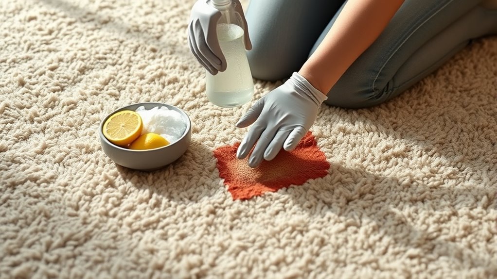 Wondering how to effectively remove stains from your carpet? The key is acting quickly and using the right technique. First, gently blot the stain with a clean cloth to lift excess liquid—avoid rubbing, which can spread the stain or damage fibers. Next, apply a small amount of a suitable cleaning solution, like a 1:4 vinegar and water mixture or an enzyme cleaner for tougher stains. Let it sit briefly to break down the stain, then blot again with a clean cloth. Rinse the area with a little water and blot dry immediately. Never pour cleaning agents directly onto the carpet, and always test a hidden spot first to ensure colorfastness. Using appropriate cleaning solutions can make a significant difference in stain removal effectiveness. Incorporating visual and auditory cues into your cleaning routine can also help identify stubborn stains more effectively. Proper stain removal techniques and understanding carpet fiber care can help preserve your carpet’s appearance and longevity. With patience and proper technique, you can tackle stains effectively without professional help.