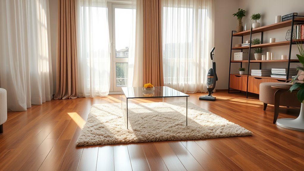 Using sealed vacuum cleaners equipped with HEPA filters is one of the most effective ways to reduce indoor dust. These vacuums prevent dust particles from escaping back into the air during cleaning, guaranteeing you capture even microscopic dust. Their high-efficiency filters trap particles as small as 0.3 microns, markedly improving air quality. Regular use decreases dust buildup on surfaces and prevents resuspension caused by traditional vacuums. To maximize effectiveness, choose a sealed vacuum with a HEPA filter and seal all gaps to prevent leaks. Maintain your vacuum by cleaning filters and replacing parts as needed. Here’s a quick comparison: