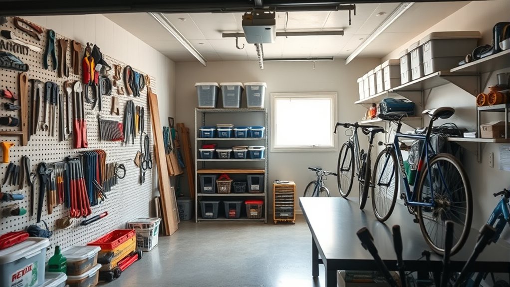 To keep your garage looking great long-term, establish a routine. Spend ten minutes at the end of each week tidying up and returning items to their designated spots. This habit prevents clutter from piling up again. Invest in clear storage bins for small parts like nails, screws, and gardening supplies, so you can see what’s inside without rummaging. Utilize vertical space wherever possible—install hooks on the ceiling for bikes or seasonal decorations. This way, you maximize every inch of your garage and keep it clutter-free.