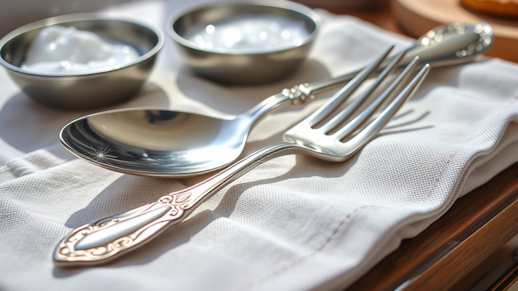 Start by gathering your supplies. You’ll need a gentle silver polish or a homemade paste made from baking soda and water, a soft microfiber cloth, and a gentle brush if needed. When tackling tarnish, avoid abrasive scrubbers or harsh chemicals, as these can scratch or dull your silverware. Instead, focus on gentle polishing techniques that lift away tarnish and restore shine.