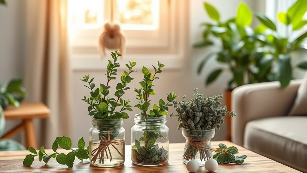 Indoor plants like mint, thyme, and lavender can serve as natural barriers against spiders by releasing scents that repel them. Placing these plants near windows, doorways, or in corners creates a continuous, subtle fragrance that deters spiders from settling indoors. These plants not only act as natural repellents but also enhance your home’s ambiance and air quality. To maximize effectiveness, you should: