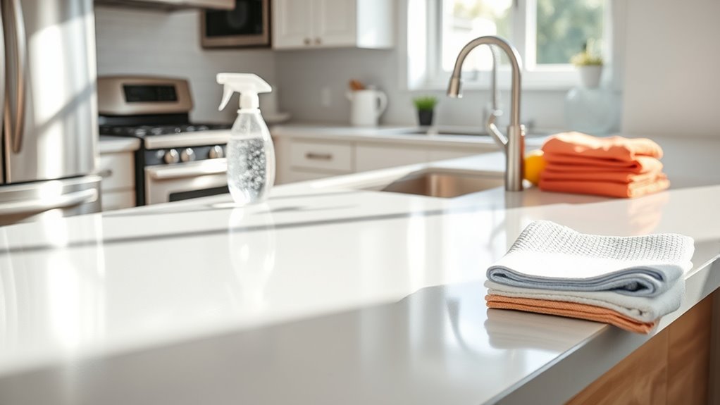 Have you ever noticed how stubborn cooking residues cling to surfaces, making cleaning a challenge? To remove surface residues effectively, start by wiping down your countertops, stove, and appliances with a damp cloth. Use a degreasing cleaner suited for the surface—whether it’s ceramic, stainless steel, or glass—to break down greasy film. For tough spots, let the cleaner sit for a few minutes before scrubbing with a non-abrasive pad or brush. Pay special attention to burners, knobs, and drip trays where grease and food particles hide. Rinse thoroughly with clean water to remove any leftover residue and cleaner. Dry surfaces with a clean cloth to prevent streaks and streaks. Regularly removing surface residues keeps your kitchen hygienic and makes deep cleaning easier.