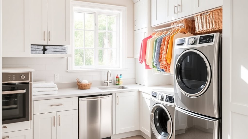 To save space for laundry appliances, consider stacking your washer and dryer to maximize vertical space. Use a folding station nearby for convenience, and store laundry baskets underneath or on wall-mounted shelves to keep everything accessible without clutter. You can also install slim cabinets or hooks for detergents and tools, ensuring your laundry room stays organized and functional even in tight spaces.