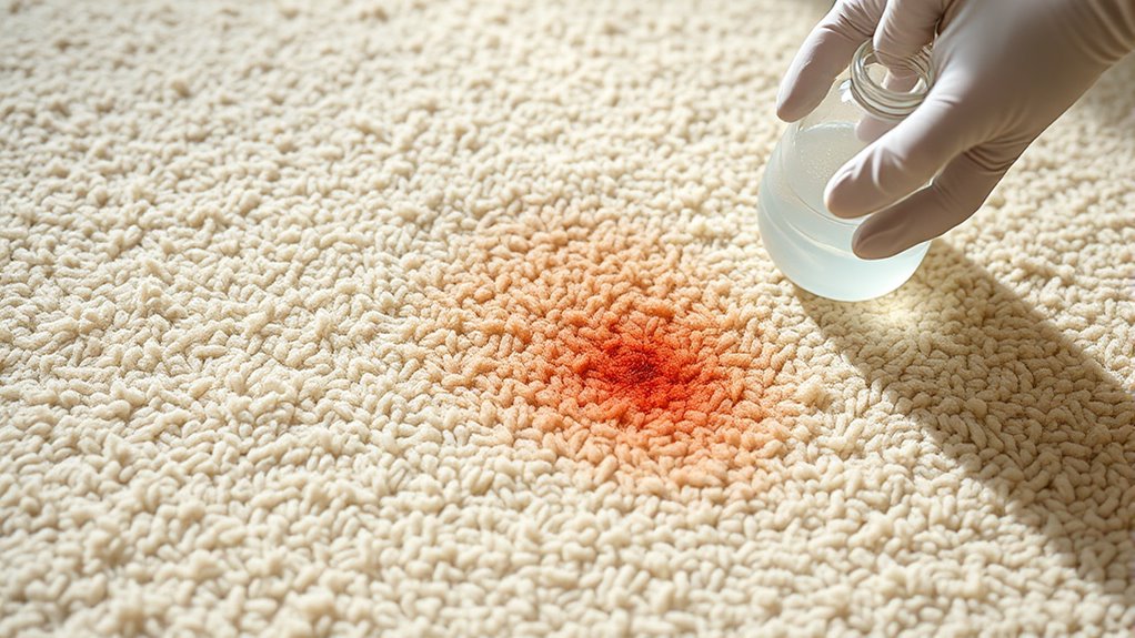 To guarantee your cleaning efforts effectively neutralize pet odors without damaging your carpet, it’s essential to test any product before full application. This prevents discoloration, fiber damage, or lingering stains.