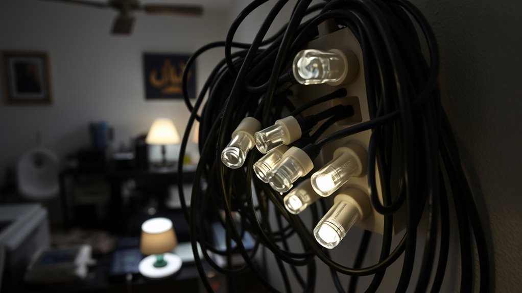Using extension cords can increase overload risk if you’re not careful. Poorly rated power strip hazards and improper cord length considerations can lead to overheating or electrical fires. Always make certain your extension cords are rated for the devices you’re plugging in, and avoid daisy-chaining multiple cords. Keep cords manageable in length to prevent strain on outlets and minimize the chance of overloading. Regularly check cords for damage to stay safe.