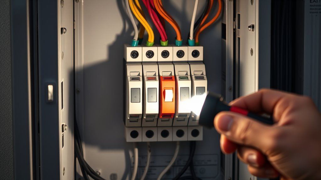 To troubleshoot breaker trips, you’ll need a circuit tester to check for voltage and verify connections. Also, grab screwdrivers—preferably insulated ones—to safely remove panel covers and examine wiring. Use the tester to identify faulty outlets or switches causing overloads, and tighten any loose connections. Always turn off the main power before working inside your breaker panel, and if you’re unsure, consider consulting a professional electrician for safety.
