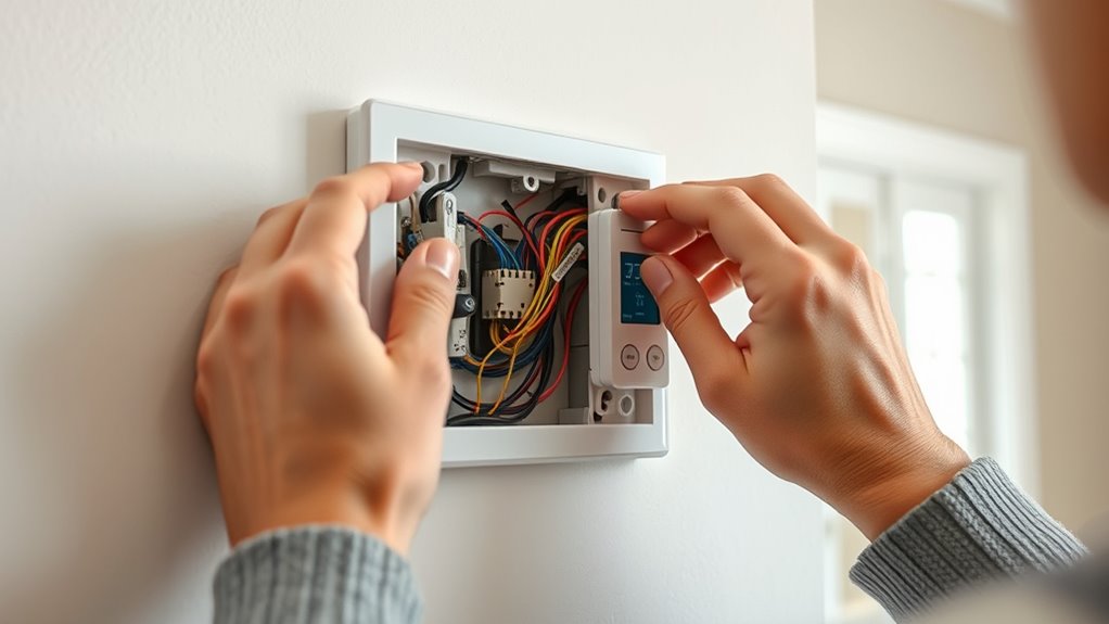 Installing a smart thermostat can substantially improve your home’s energy efficiency and comfort. With its advanced features, you can easily control your heating and cooling remotely, making it simple to adjust settings when you’re away or just relaxing at home. One of the key benefits is its wireless connectivity, which allows you to connect your thermostat to your Wi-Fi network effortlessly. This wireless connection enables you to manage your climate system through a smartphone app, giving you real-time control and insights into your energy consumption. As a result, you’ll notice energy savings, especially if you optimize your settings based on your schedule and preferences. Additionally, understanding the importance of contrast ratio can help you choose a compatible display or screen for your home setup. Before starting the installation, turn off your HVAC system to prevent any electrical accidents. Remove the old thermostat by carefully disconnecting its wires. Take a picture of the wiring or note down the connections to guarantee proper reinstallation of the new device. Most smart thermostats come with a step-by-step guide, but generally, you’ll connect the same wires to corresponding terminals on the new unit—often labeled R, W, Y, G, and C. Many models are compatible with common wire configurations, but if you have a more complex wiring system or use multiple stages of heating or cooling, consult the manufacturer’s instructions or consider professional help.