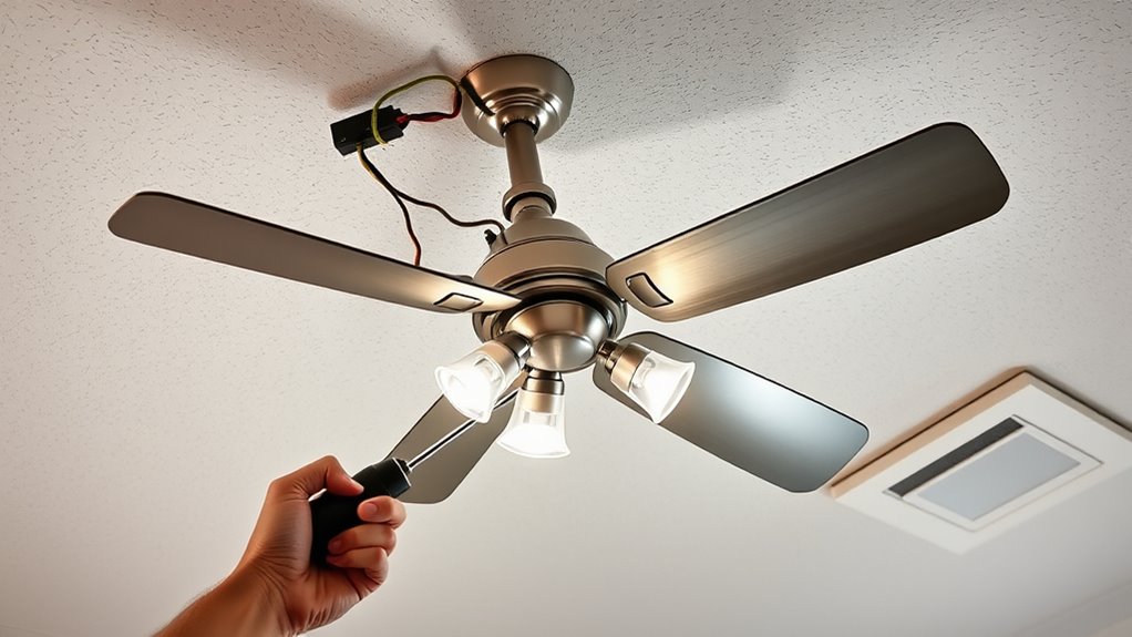 To replace a light fixture with a ceiling fan, turn off the power at the circuit breaker, then carefully remove the existing fixture and disconnect the wires. Mount a fan-rated ceiling box if needed, connect the fan wires to the house wiring—black to black, white to white, and ground properly—and secure the fan to the ceiling. If your fan has a remote or switch, set it up accordingly. To make certain of a safe and successful install, there’s more to consider if you keep going.