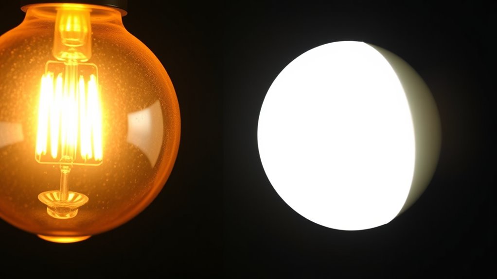 Switching from incandescent bulbs to LEDs saves you money by cutting your energy bills up to 80%. LEDs last up to 25 times longer, so you replace bulbs less often and reduce waste. They stay cooler and safer, lowering fire risks. Although LEDs cost more upfront, their durability and energy efficiency make them cheaper in the long run. Keep exploring to discover how switching benefits both your wallet and the environment.
