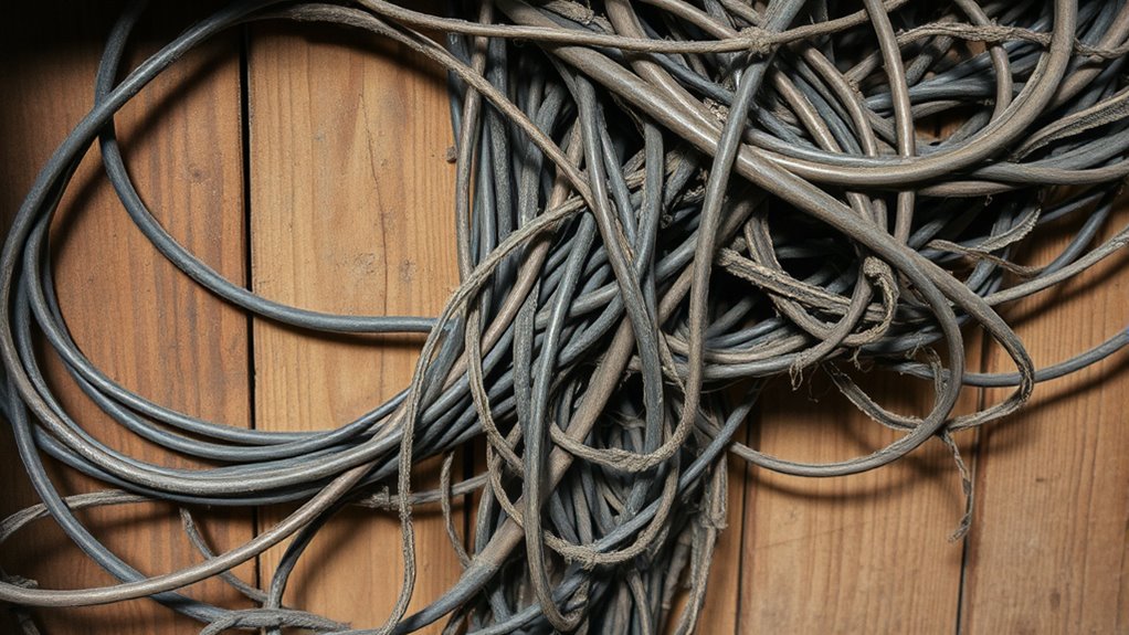 To identify outdated wiring, look for signs like ceramic knobs and tubes indicating knob and tube systems, or visible aluminum wiring in outlets and panels. Check for deterioration, frayed or discolored wires, and a lack of grounding conductors. If your home was built before the 1960s or 1970s, it likely has old wiring that needs inspection. Ignoring these signs can be dangerous, so understanding how to spot and address these issues can help keep your home safe—more details await.