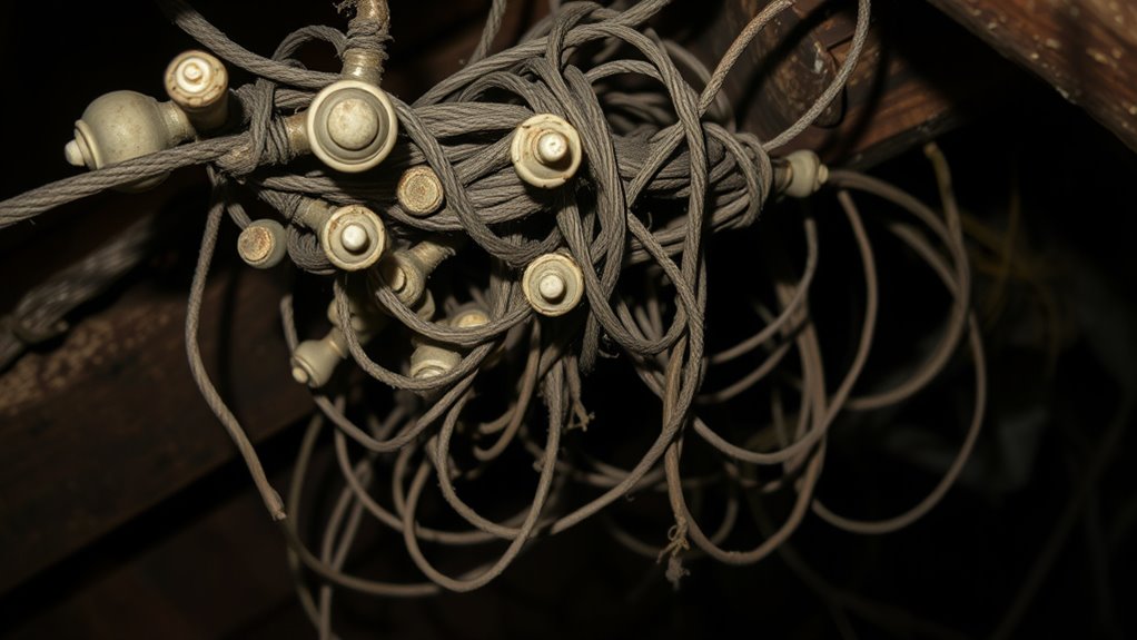Knob-and-tube wiring is an old electrical system from the late 1800s and early 1900s that uses ceramic knobs and tubes to run wires through walls and ceilings. It was innovative back then but is now outdated and lacks grounding, insulation, and safety features. Over time, deterioration of components can cause exposure to live wires, increasing the risk of fires and shocks. If you want to learn how to address these issues safely, keep exploring.
