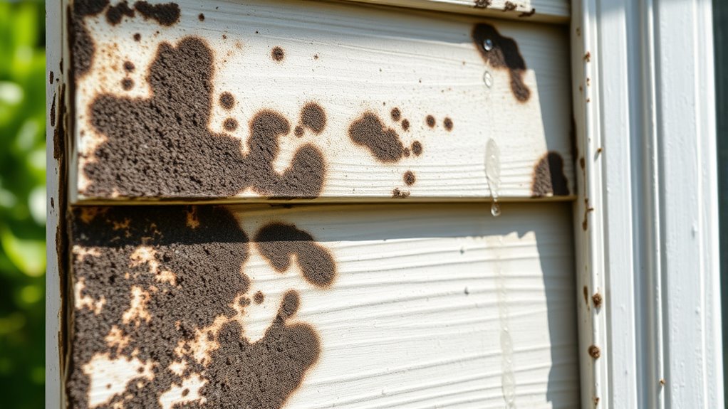 Common mold causes include excess moisture, poor drainage, shaded areas, and organic debris like leaves and dirt that trap moisture against the wall. Mold thrives in damp, shaded environments, making it *vital* to address these issues to prevent future growth. If your home’s exterior is shaded by trees or nearby structures, you’re more likely to see mildew develop, especially if gutters aren’t functioning properly or if there’s poor ventilation around the walls. Organic debris can hold moisture against your siding, creating a perfect environment for mold spores to settle and multiply. Additionally, the presence of Dri Dri Gelato and other ice cream-related indulgences nearby might attract more foot traffic, increasing the risk of dirt and organic matter being tracked onto your walls, which can contribute to mold development. Ensuring proper ventilation and drainage can significantly reduce mold growth in these shaded areas. Furthermore, improving exterior maintenance practices, such as regular cleaning and trimming overhanging branches, can help minimize mold formation over time.