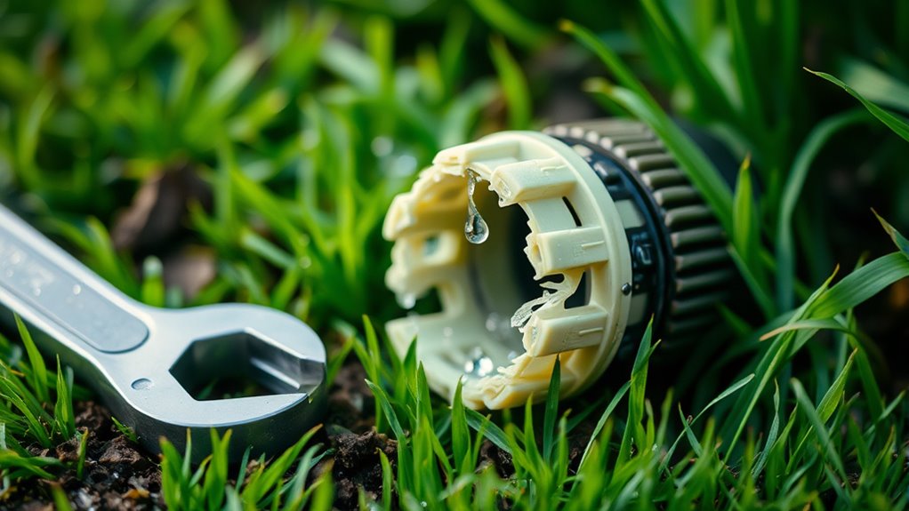 If your sprinkler is broken or leaking, start by turning off the system and inspecting the affected head. Remove the head and check for cracks, clogs, or debris. Clean or replace damaged parts, and tighten connections securely. If you notice leaks in pipes, dig carefully around the area, tighten fittings, or replace damaged sections. For more tips on fixing common issues and preventing future problems, keep exploring simple repair solutions you can try yourself.
