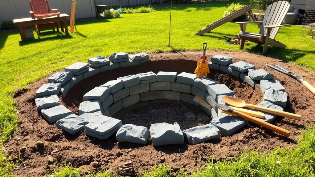 Start by finding a flat, open spot that’s clear of obstacles and debris. Use a level or straightedge to make sure the ground is even, making your excavation more stable. Mark the area carefully so you know exactly where to dig, keeping safety and accessibility in mind. Ensure that your chosen location is compliant with local regulations and best practices for safe outdoor construction regulations and safety. Incorporating ventilation considerations in your planning can help create a space that is comfortable and functional for all users. Additionally, understanding power supply safety principles can help prevent hazards during construction and future use. Being aware of fire safety guidelines can further ensure your fire pit remains a safe feature in your backyard.