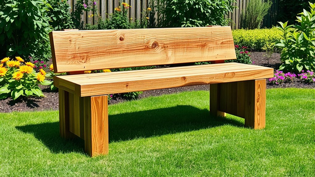 They say “you get what you pay for,” and building your outdoor bench costs roughly $50 to $150, depending on your material choices. Your total cost estimation covers material expenses like wood, screws, and sealant. If you opt for reclaimed wood, you might spend less, but premium lumber increases the price. Planning ahead guarantees you stay within budget while creating a sturdy, attractive garden bench.