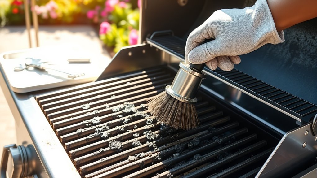 Start by removing all grill components, such as the grates, flavorizer bars, heat deflectors, and burner covers, to access all areas that need cleaning. Carefully lift each part to prevent damage and set them aside for separate cleaning. Use a putty knife or scraper to loosen stuck-on food and grease from the grates and other removable parts. Scrub these components with abrasive pads or non-scratch sponges, paying attention to corners and crevices. Clean the flavorizer bars and heat deflectors thoroughly, removing grease buildup. For stubborn residue, soak parts in warm, soapy water before scrubbing. Once all components are clean, rinse them with water and dry completely. This step ensures your grill is ready for a deep clean and peak performance. Proper cleaning not only maintains the grill’s appearance but also enhances its longevity and performance. Additionally, regular maintenance helps prevent rust and corrosion that can compromise your grill’s structure over time, especially when you understand materials and heat distribution. Incorporating the right cleaning techniques based on material composition can further extend the life of your grill.