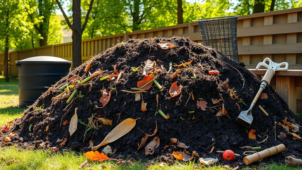 To start your backyard compost pile, choose a flat, well-drained spot with partial sunlight away from fences and neighbors. Gather brown materials like leaves and straw, and green scraps such as vegetable peels and coffee grounds, chopping large items for faster breakdown. Layer browns and greens, keeping the pile moist but not soggy. Turn it regularly to aerate, monitor temperature, and keep odors at bay. If you keep at it, you’ll discover how to transform waste into rich soil.
