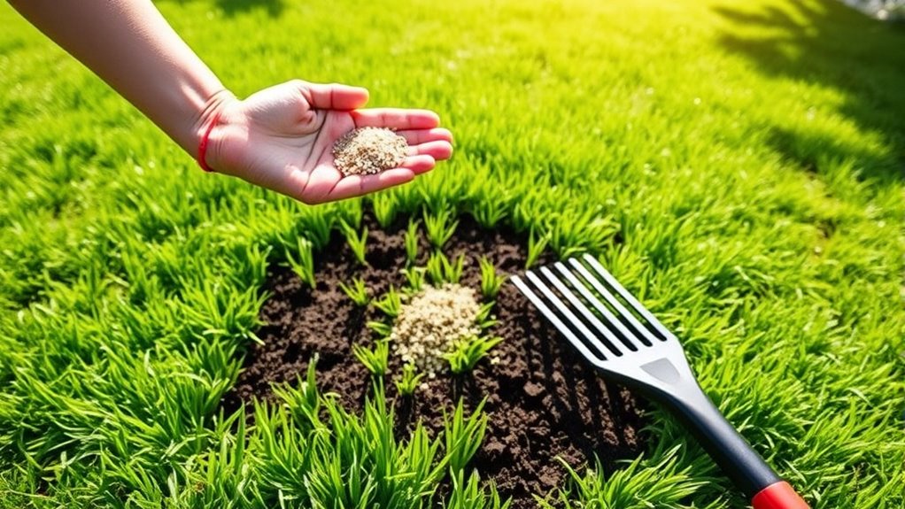 You’ll need essential tools like a rake to loosen soil and remove debris, a garden hoe for soil preparation, and a trowel for precise planting. Choose high-quality seed suited for your soil and climate, and consider a lawn roller to ensure good seed-to-soil contact. These tools help you prepare the area properly and select the right seed, promoting healthy grass growth and filling in bare patches effectively.