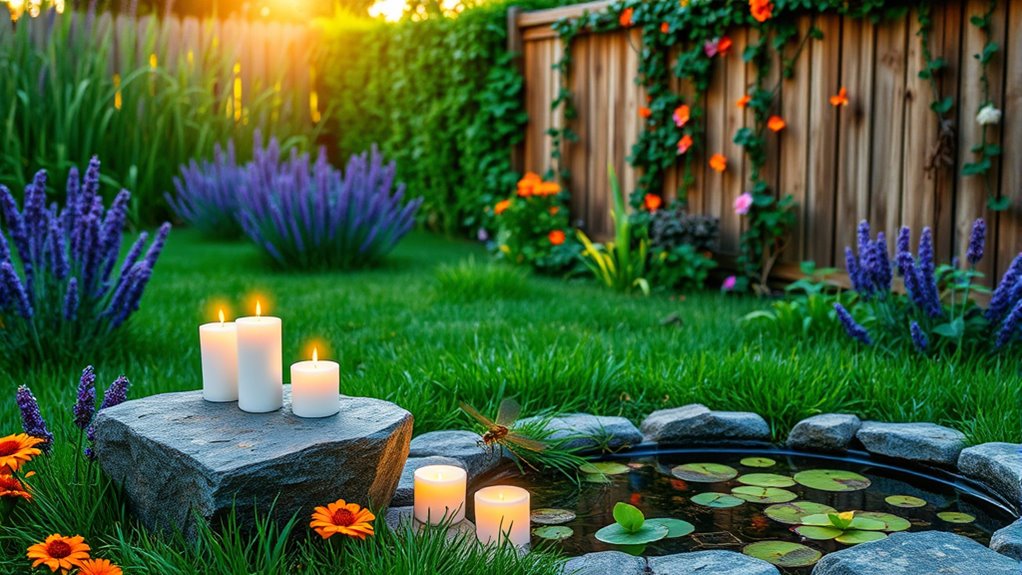 To reduce mosquitoes naturally, start by eliminating standing water in containers, gutters, and low spots, and regularly trim vegetation to remove hiding spots. Introduce mosquito fish or apply Bti larvicides to target larvae safely. Use natural repellents like citronella or lemon eucalyptus oils, and plant herbs such as basil and lavender around your yard. Combining these strategies creates an eco-friendly, lasting solution that keeps mosquitoes away—discover more effective tips by continuing on.