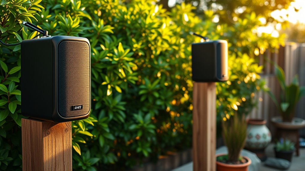 When installing weatherproof speakers, pay attention to their wiring and power sources. Conceal cables beneath outdoor furniture or along garden pathways to keep the area tidy and safe. Use weatherproof connectors and conduit to protect wiring from moisture and weather conditions. Wireless options can simplify installation, reducing clutter and making it easier to reposition speakers if needed. Always test the sound quality and coverage before finalizing placement, ensuring consistent sound throughout your outdoor space. Additionally, understanding the comparative advantage of different speaker models can help you select the best option for your needs.
