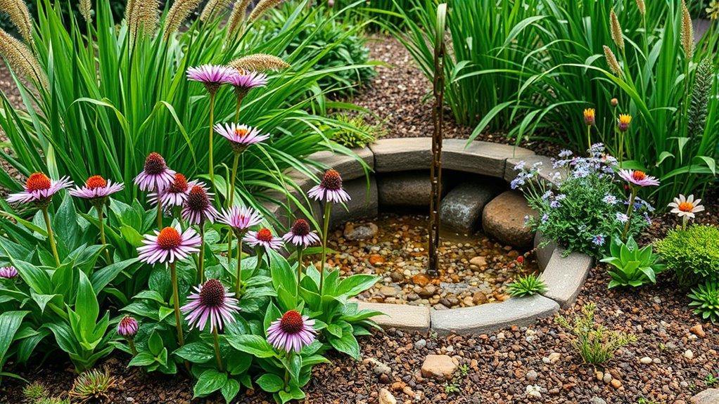 Incorporating native plants also simplifies your maintenance routine. Since they’re adapted to your environment, they require less watering, fertilizers, or pesticides. Their deep roots increase soil permeability and help your rain garden handle larger storm events. Additionally, native plants tend to be more resistant to pests and diseases, making your rain garden more resilient over time. When planting, arrange species based on their water needs, with the most water-loving plants at the center or lowest point, gradually transitioning to more drought-tolerant species around the edges. Understanding deeper root systems can enhance soil stability and water absorption, further improving your rain garden’s effectiveness.