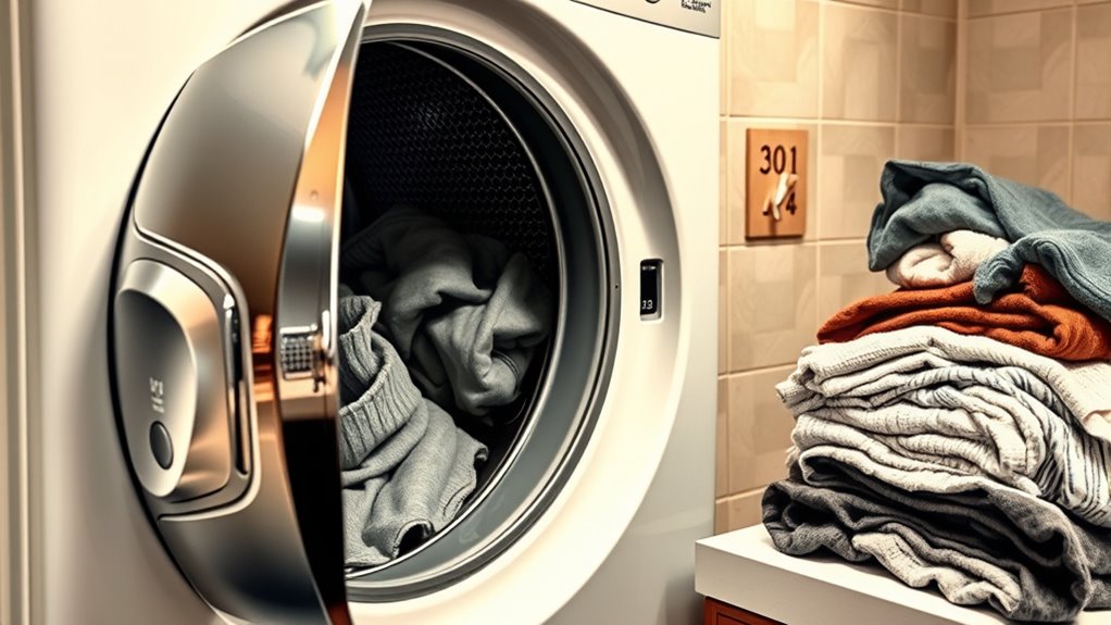 Overloading your dryer can indeed cause clothes not to dry properly. When you pack it too full, lint buildup and restricted airflow can prevent the heating element from working efficiently. This reduces heat circulation, prolonging drying times or leaving clothes damp. To fix this, load fewer items, clean the lint filter regularly, and make certain airflow isn’t blocked. Doing so helps your dryer dry clothes faster and prevents damage.