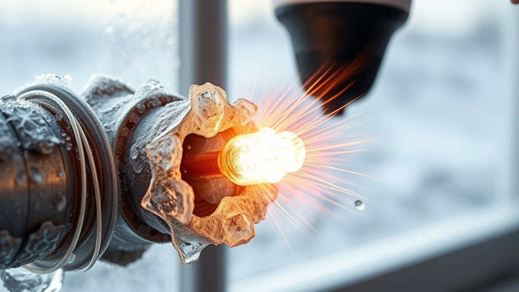 Did you know that over 250,000 homes experience pipe bursts due to freezing each year? To safely thaw frozen pipes, use tools like pipe insulation and heat tape. These are your best options because they direct gentle heat where needed without causing damage. Avoid open flames or direct heat sources, and always monitor the temperature to prevent pipe damage. Proper tools guarantee quick, safe thawing and protect your home.