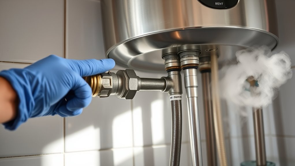 If you’re getting no hot water, start by checking if the pilot light is lit for gas models or the electrical connections for electric heaters. Verify the thermostat is set around 120°F, and inspect the pressure relief valve for leaks. Sediment buildup can also reduce efficiency, so consider flushing the tank. If these steps don’t resolve the issue, there might be a malfunction with components or safety features. Keep exploring to find more solutions.