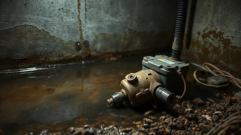 Picture your sump pump as a vigilant guardian, guarding your basement from water’s sneak attack. To keep debris from clogging it, regularly perform sump pump maintenance—clean the basin and check the inlet screen. Consider alternative sump pump types like submersible or pedestal models, which often have better debris resistance. Protect your pump’s flow, and it’ll stand sentinel against clogs, ensuring your basement stays dry and safe.