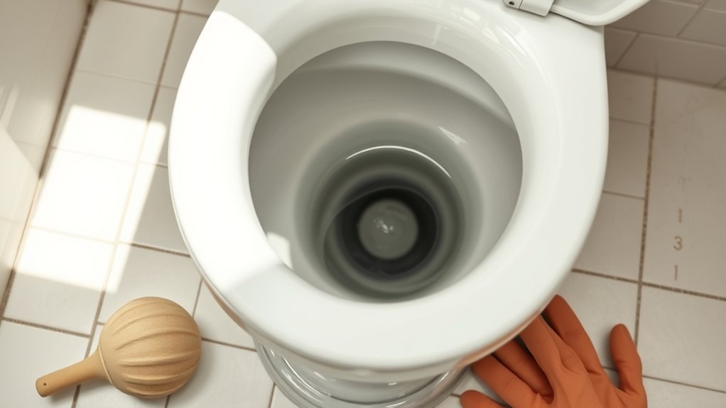 When tackling a stubborn clog, a sturdy plunger is your best tool—use proper plunger techniques for maximum effect. If that doesn’t work, consider inspecting the vent pipe for blockages, which can cause drainage issues. A flange plunger is often more effective for toilets than a standard cup one. Avoid harsh chemicals; instead, rely on these simple tools to restore your toilet’s flow effortlessly.