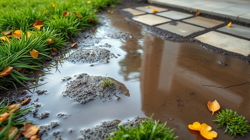 To improve yard drainage and prevent water pooling, start by evaluating your landscape grading. Create a gentle slope away from your foundation, ideally 2%, extending at least 10 feet. Incorporate stormwater management features like rain gardens, French drains, or dry wells, and add permeable surfaces to boost water absorption. Regularly maintain gutters and downspouts to direct runoff away from your yard. Keep exploring to uncover more effective strategies for a dry, healthy yard.