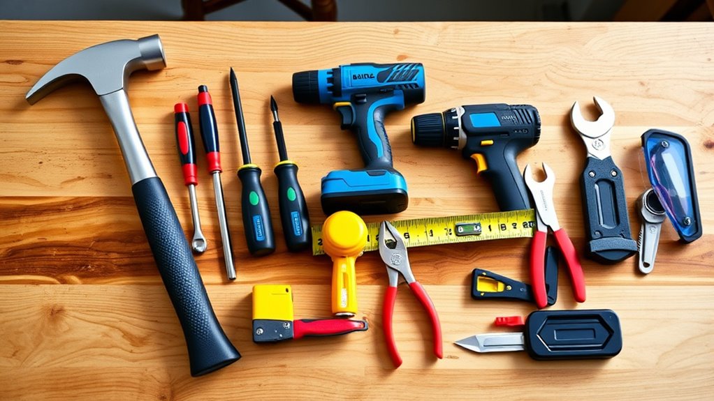 As a homeowner, you’ll want essential tools like a claw hammer, multi-bit screwdriver, adjustable wrench, and pliers set to handle most repairs. A tape measure with a locking mechanism guarantees accurate measurements, while a handsaw and utility knife help with cutting jobs. For power tasks, a cordless drill and reciprocating saw are unbeatable. Don’t forget putty knives, caulking guns, and basic plumbing tools. Keep these gear in mind—you’ll soon discover how they make every repair easier.