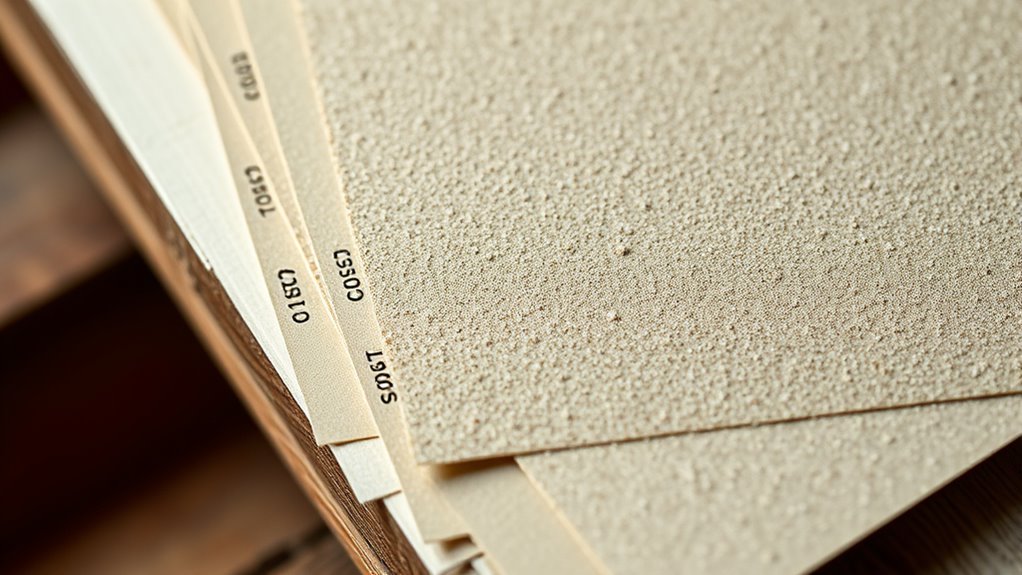 When choosing sandpaper, you also need to contemplate grit, which indicates the size of the abrasive particles. Grit comparison helps you determine how coarse or fine the sandpaper will be. Coarse grits, usually labeled around 40 to 60, are best for stripping paint or removing rough material quickly. Medium grits, like 80 to 120, work well for general sanding, shaping, or smoothing rough surfaces. Fine grits, from 150 to 220, are used for finishing and preparing surfaces for painting or staining. Extra-fine grits, 240 and above, are suited for polishing and achieving a smooth, glossy finish.