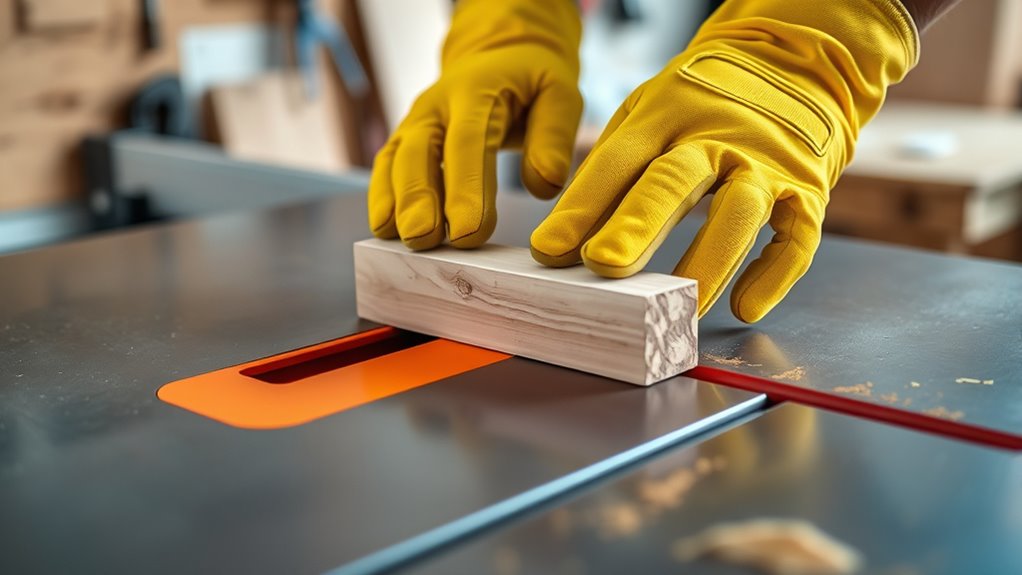 To use a table saw safely, start by wearing safety gear like eye and ear protection. Always keep the blade guard and push sticks in place for added safety. Before cutting, double-check the saw and verify the blade is sharp and properly aligned. Support your workpiece and maintain a steady pace without forcing the wood. Stay focused and keep your hands away from the blade. Following these safety steps will protect you and ensure successful cuts; learn more about proper techniques as you go.