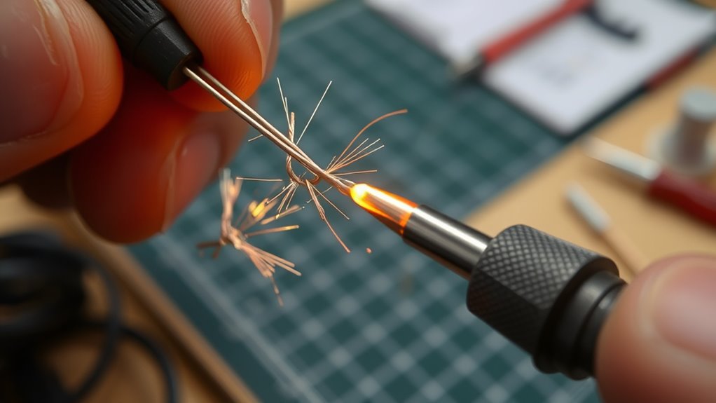 To guarantee a strong and reliable solder joint, you need to twist the wire strands tightly together. This ensures good electrical contact and mechanical strength. First, hold the stripped wire ends and twist the strands clockwise until they form a uniform, solid core. Next, clean the exposed wire end to remove dirt, corrosion, or oxidation that could hinder solder flow. Use a wire brush or abrasive pad if needed. Additionally, ensuring the wire strands are properly twisted tightly helps create a more reliable solder joint. Inspect the twisted wire for loose strands and trim any protruding bits. This step prevents shorts and ensures a neat connection. Properly preparing wire ends by twisting and cleaning is essential for achieving high-quality solder joints. Incorporating proper wire handling techniques can further improve the quality of your soldering work. Remember these key points:
