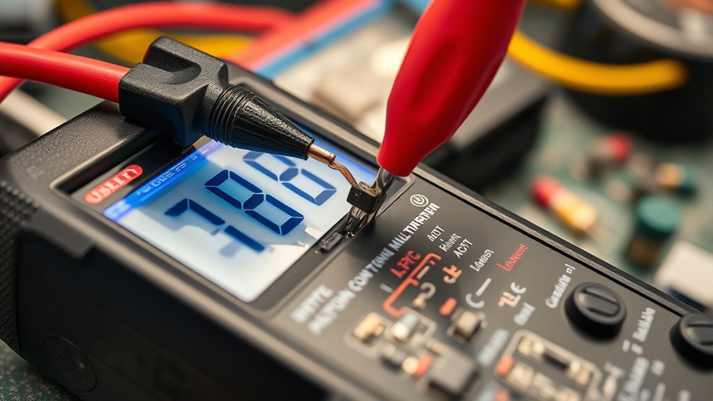 Imagine chasing a silent whisper in a tangled web—your wires. To test for broken or damaged wires, set your multimeter to continuity mode. Place the probes at each end of the wire. If you hear a beep, the connection’s intact; if not, the wire’s broken or damaged. Remember, disconnect power first. This simple test reveals hidden faults, restoring harmony to your electrical symphony.