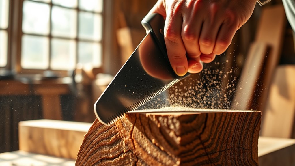 Wood grain substantially impacts saw accuracy because it influences how the material responds during cutting. When you cut against the grain, the blade can catch or tear, causing crooked or rough edges. To improve accuracy, you should cut with the grain whenever possible and support the wood properly to prevent shifting. Choosing straight-grain, defect-free lumber also helps guarantee cleaner, straighter cuts and reduces deviations caused by grain irregularities.