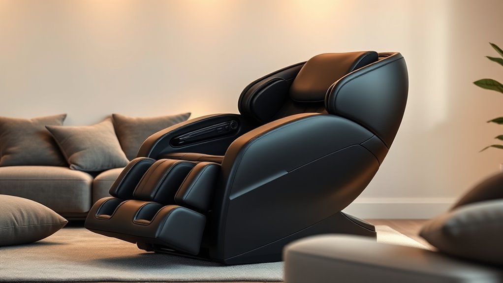 Choosing a massage chair that fits your body comfortably makes all the difference in enjoying a truly relaxing experience. Look for models with adjustable features like footrest extension and backrest tilt to suit different body sizes and enhance comfort. An ergonomic design that supports your natural spinal curve and targets specific muscle groups can prevent strain and improve relief. Opt for chairs with customizable massage modes and intensity levels, so you can personalize the experience to your preferences. Body scan technology is a huge plus—it automatically detects your shape and adjusts accordingly for a precise fit. Finally, consider how easy it is to operate controls, whether via remote or touchscreen, ensuring you can make adjustments effortlessly without strain. Comfort truly makes the massage experience complete.