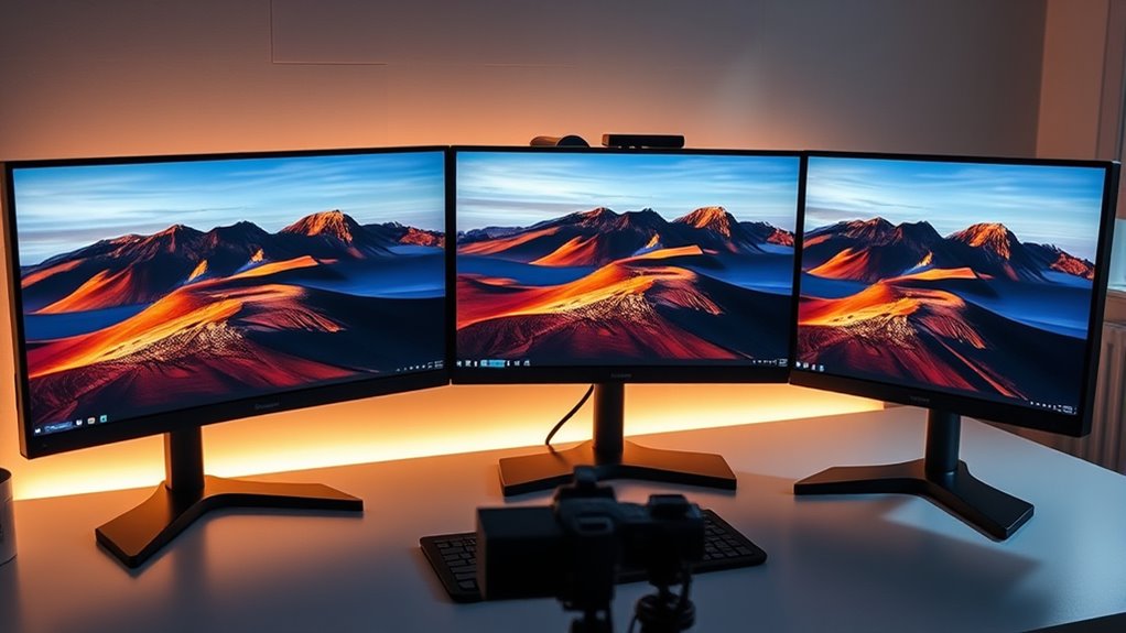 Since accurate color representation is essential for professional photo editing, I pay close attention to a monitor’s calibration and software support. Monitors with factory pre-calibration and reports showing Delta E < 2 give a solid starting point for color accuracy. Compatibility with calibration software like X-Rite i1Profiler or SpyderX lets me fine-tune settings for precise results. Hardware calibration support, through dedicated sensors, helps maintain consistent color over time, reducing drift. Additionally, monitors with advanced color management features and LUT support enable me to execute complex calibration workflows, ensuring my edits remain reliable and true to the original images. These tools and features are crucial for achieving professional-grade accuracy and consistency in my work.