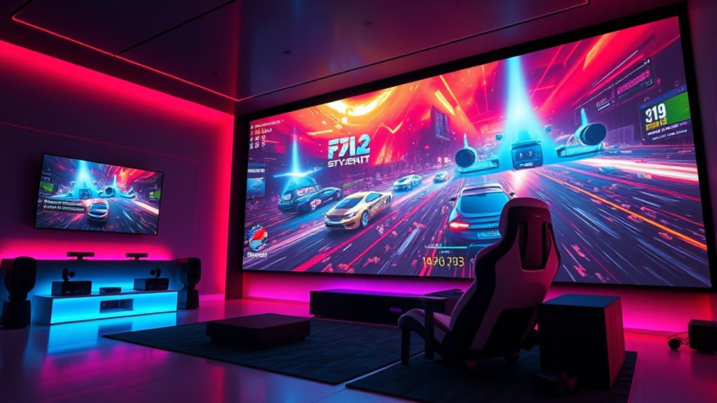 Clear visuals are important, but in fast-paced gaming, responsiveness matters just as much. Low input lag, ideally under 20 milliseconds, ensures your commands translate quickly to on-screen action, which is critical in competitive play. Response time, measured in milliseconds, affects how smoothly images change, impacting gameplay fluidity. Many gaming projectors feature dedicated low latency modes that cut lag to as little as 4-10ms, minimizing delays between controller inputs and the action you see. Refresh rates also matter; higher rates like 120Hz or 240Hz make gameplay more responsive and reduce motion blur. When choosing a projector, look for a balance between low input lag and high refresh rates to achieve both quick reactions and crisp visuals, giving you an edge in fast-paced gaming scenarios.