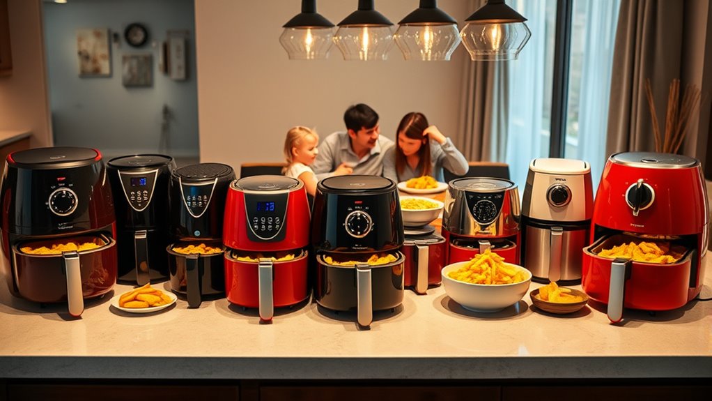 As I explore the world of air fryers, I can’t overlook the significance of safety features, especially for large families. With kids running around, I want to ensure my cooking appliances are safe. Features like auto-shutoff and overheat protection are vital—they prevent accidents and appliance damage. I also appreciate stay-cool handles and secure lid locks, which minimize the risk of burns or spills when I’m juggling meals. Digital controls with child-lock functions offer peace of mind, keeping little hands from unintentionally starting the fryer. Additionally, I look for air fryers with cETL approval, confirming they meet strict safety standards. Clear viewing windows and internal lighting let me monitor cooking progress without opening the unit, further enhancing safety during meal prep.