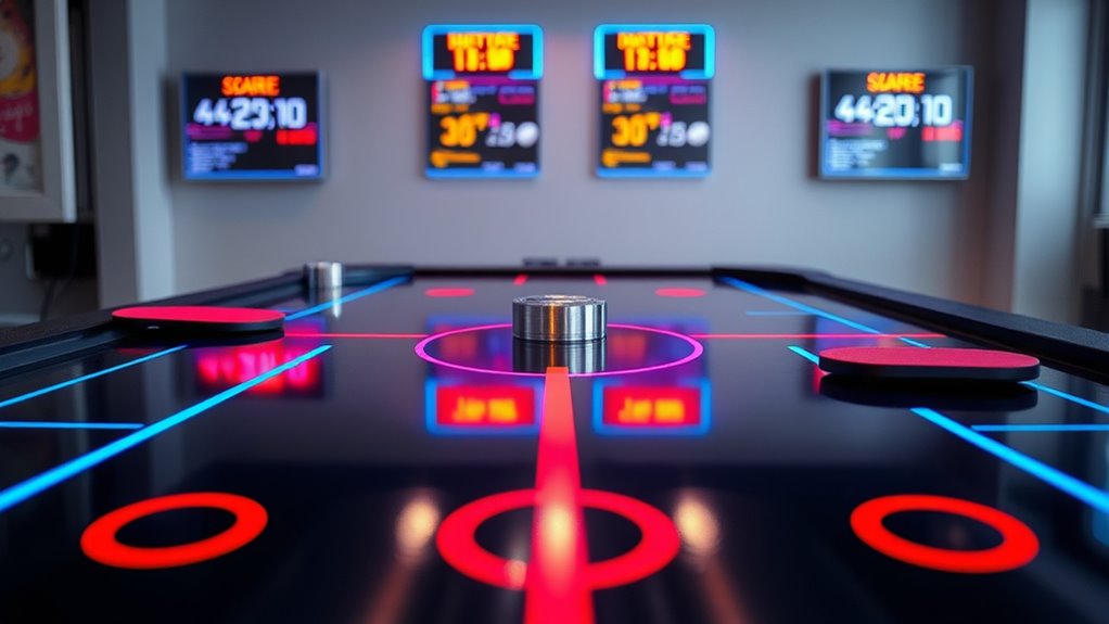 Built-in scoring features can substantially enhance your air hockey experience by providing real-time updates and reducing manual errors. Electronic or digital scoreboards make it easy to keep track of points without fussing over paper or memory. Many tables also include automatic goal detection and goal indicators, which improve gameplay accuracy and ensure that every goal is recorded correctly. Some models go further by adding sound effects and visual lights, heightening excitement during matches. Customizable scoring options allow you to set game limits or reset scores quickly, keeping the game flowing smoothly. Overall, integrated scoring features streamline gameplay, making it more enjoyable and competitive. They eliminate confusion, so players stay focused on the game rather than scorekeeping.