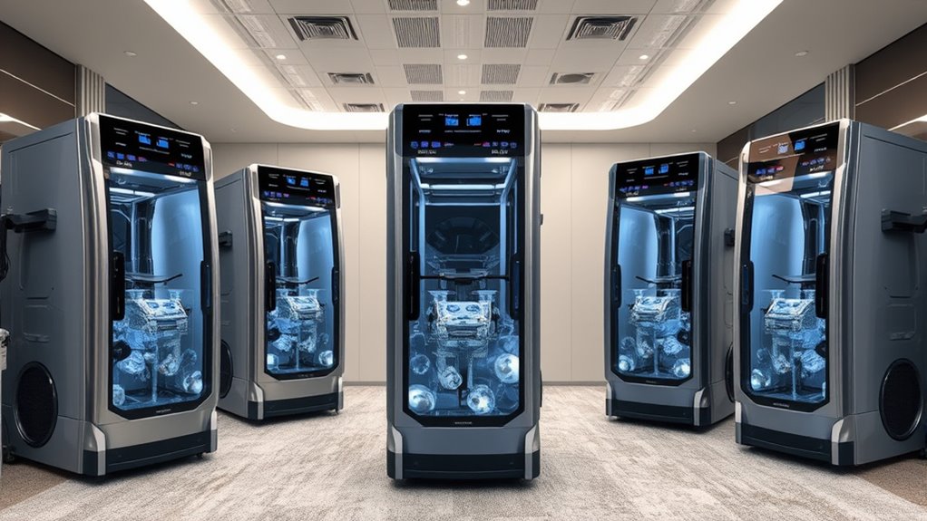 Since drying speed directly impacts how quickly you can return to using your space, choosing a machine with efficient drying capabilities is essential. Faster drying times help prevent mold and mildew growth, keeping your environment healthier. Technologies like HeatForce and similar systems boost evaporation, speeding up moisture removal. Using dry-only modes or low-moisture settings can also cut down drying time, making the process more efficient. High suction power and good airflow management are critical for extracting moisture effectively. Well-designed machines typically dry carpets or upholstery within 1 to 2 hours, minimizing downtime and inconvenience. Prioritizing these features ensures you spend less time waiting and more time enjoying your clean, dry space. Efficient drying is key to a hassle-free cleaning experience.