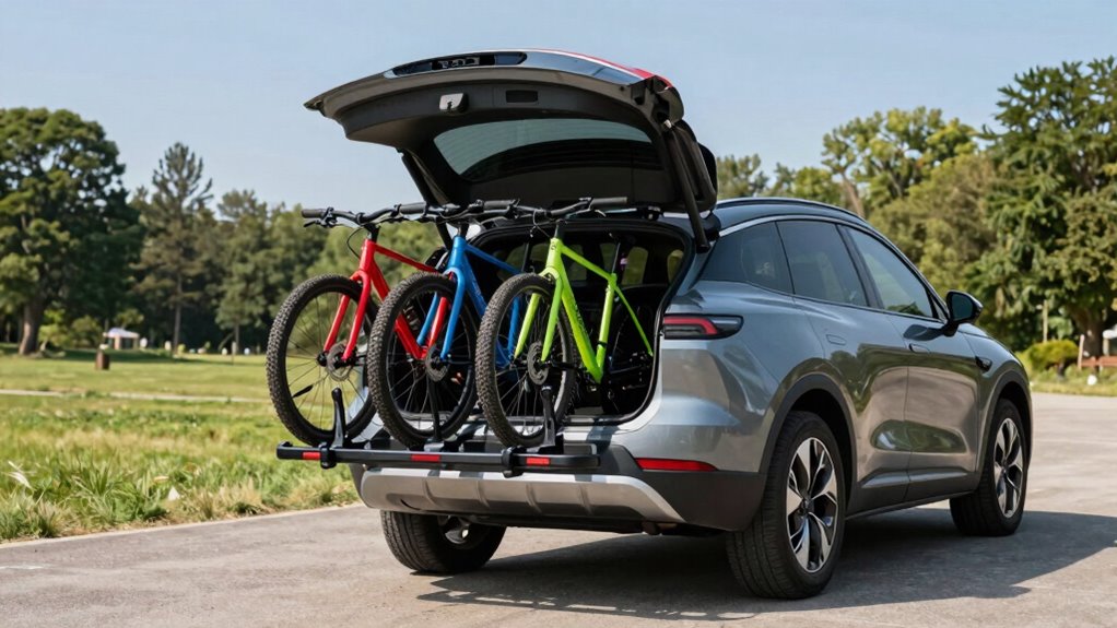 When selecting a bike rack for your SUV, it’s important to take into account whether it can support the various sizes and types of bikes you own. Make sure the rack can handle the maximum wheel width of your bikes, including fat tires up to 5 inches wide. Check if the wheel trays are adjustable to fit different bike frame sizes and wheelbases, ensuring a snug, secure fit. Consider if the rack can hold bikes with various frame types, such as mountain, road, or e-bikes, without causing damage. Verify that the maximum weight capacity matches or exceeds your heaviest bikes, especially electric models. Finally, look for racks with padded contact points and secure straps to protect and stabilize bikes of different sizes during transport.