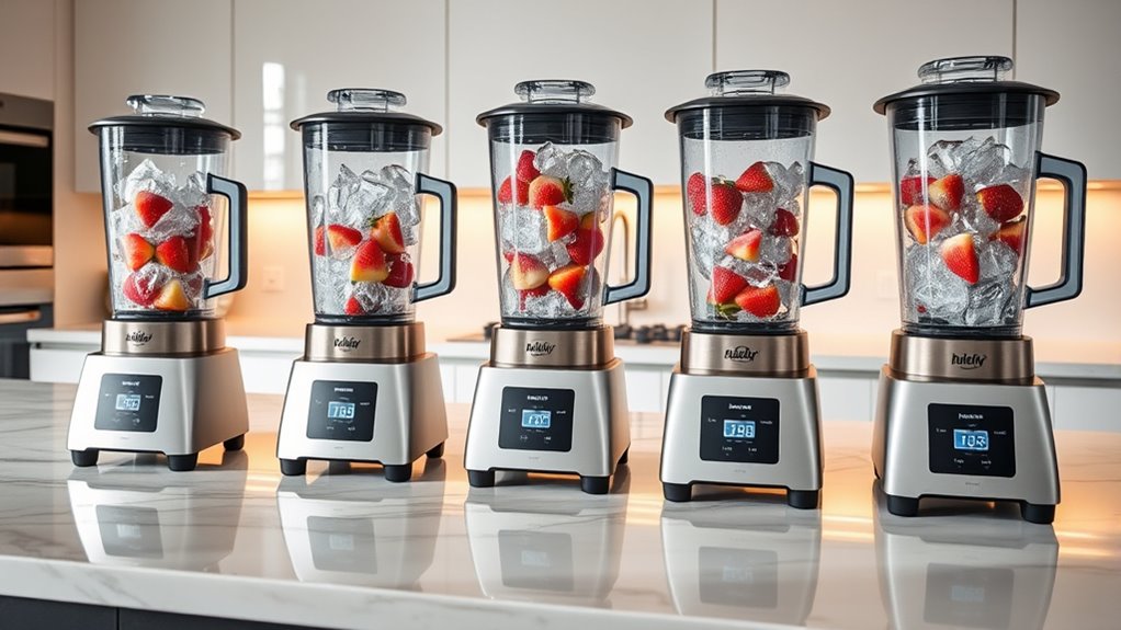 Having multiple speed settings on a blender gives you precise control over ice texture, from chunky pieces to fine snow. With 3 to 7 speed options, you can easily adjust blending intensity based on the ice’s hardness and your recipe needs. Variable speeds let you fine-tune the process, guaranteeing efficient pulverization without over-processing. Higher speed settings, often reaching 20,000 RPM or more, are essential for crushing ice effectively. Some blenders also offer preset and manual controls, giving you quick access or more customized adjustments. This flexibility helps achieve the perfect consistency for smoothies, slushes, or frozen drinks. Choosing a blender with versatile speed options ensures you can handle different ice textures and ingredients with ease, making it a key factor in your decision.