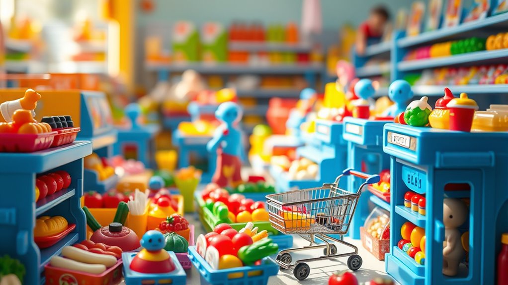 While evaluating the educational value of a Bluey supermarket playset, I find it essential to take into account how it can foster cognitive and social development in young children. These playsets encourage role-playing and scenario-based learning, which actively engage kids in imaginative play. By imitating real-life shopping experiences, children enhance their social skills, learning cooperation and communication through shared activities.