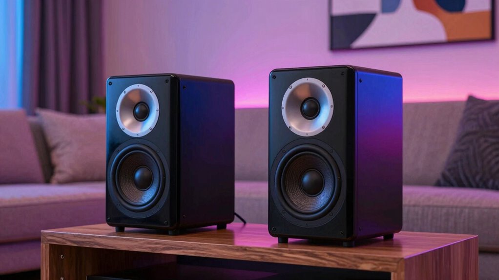 Powered bookshelf speakers improve room acoustics by combining amplification with high-quality drivers, which deliver clear, balanced sound across the spectrum. I find that their built-in amplifiers reduce the need for extra equipment, minimizing sound distortion and resonance issues. Plus, their design allows me to position them ideally, creating a more immersive listening experience. Overall, they make my space sound richer, fuller, and more enjoyable with less hassle.