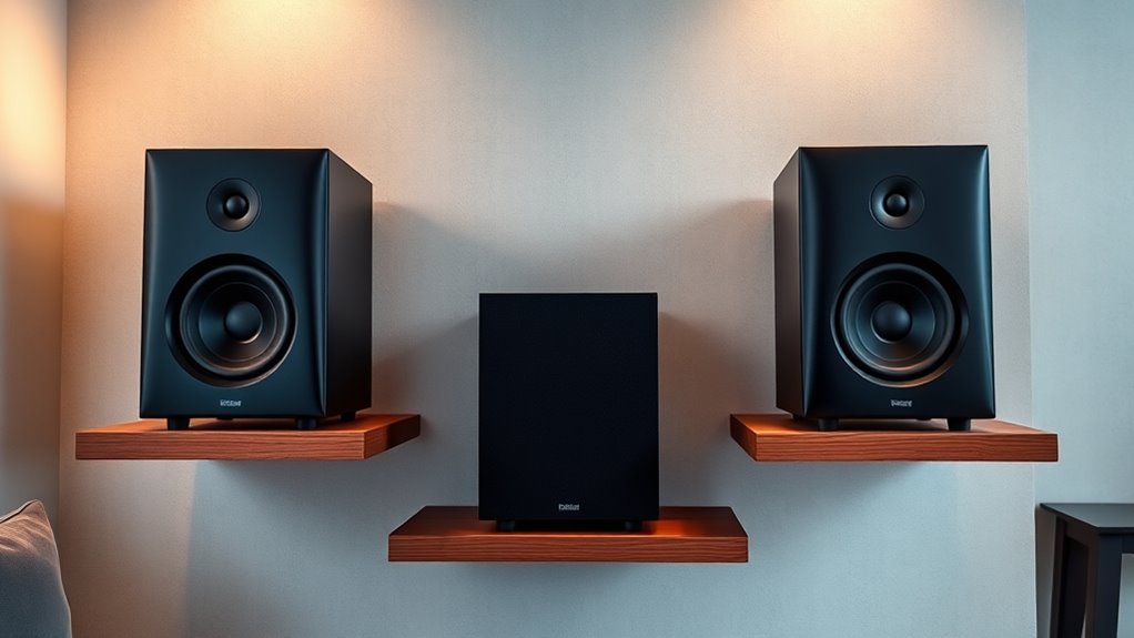 Matching your bookshelf speakers to your room’s characteristics guarantees you get the best sound experience. First, consider the room’s size and shape—smaller spaces benefit from less powerful speakers to avoid overwhelming sound, while larger rooms may need more output. Pay attention to acoustics; rooms with lots of echoes or absorption might require speakers with bass ports or sound diffusers to improve clarity. Check that the speakers’ impedance and sensitivity match your amplifier or receiver to guarantee ideal performance without distortion. Also, look at the frequency response range to see if it suits your listening preferences and environment. Finally, assess placement options—whether wall-mounting, stands, or flexibility for positioning—so your speakers fit seamlessly into your room’s layout and maximize sound quality.