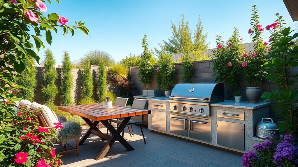 Imagine a summer evening, and your family around the grill—safety’s essential. I recommend a heat-resistant, non-slip surface around your station, and a fire extinguisher nearby. For example, I installed a built-in grill with a clear, accessible shut-off valve, which gives me peace of mind. Always ensure proper ventilation, keep combustible materials away, and add a spark arrestor to prevent flare-ups. Safety should always come first for enjoyable backyard grilling.